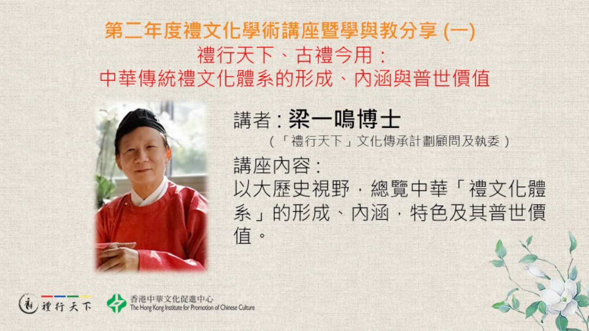 日期:2021年12月4日 主講:梁一鳴博士(「禮行天下」文化傳承計劃顧問及執委) 講座內容:以大歷史視野,總覽中華「禮文化體系」的形成
