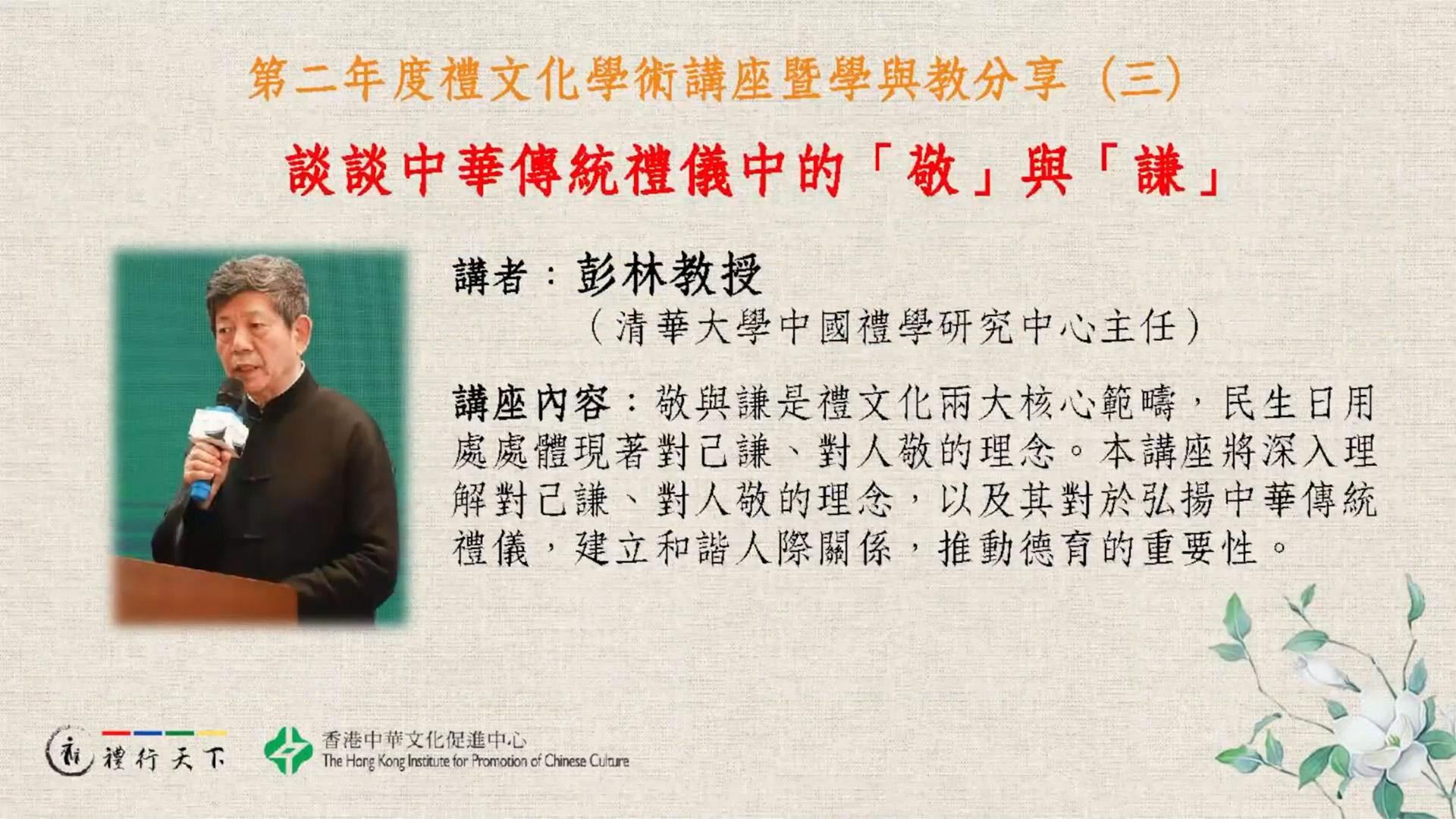日期:2022年1月15日(星期六) 主講:彭林教授(清華大學中國禮學研究中心主任) 講座內容:敬與謙是禮文化兩大核心範疇,民生日用處處
